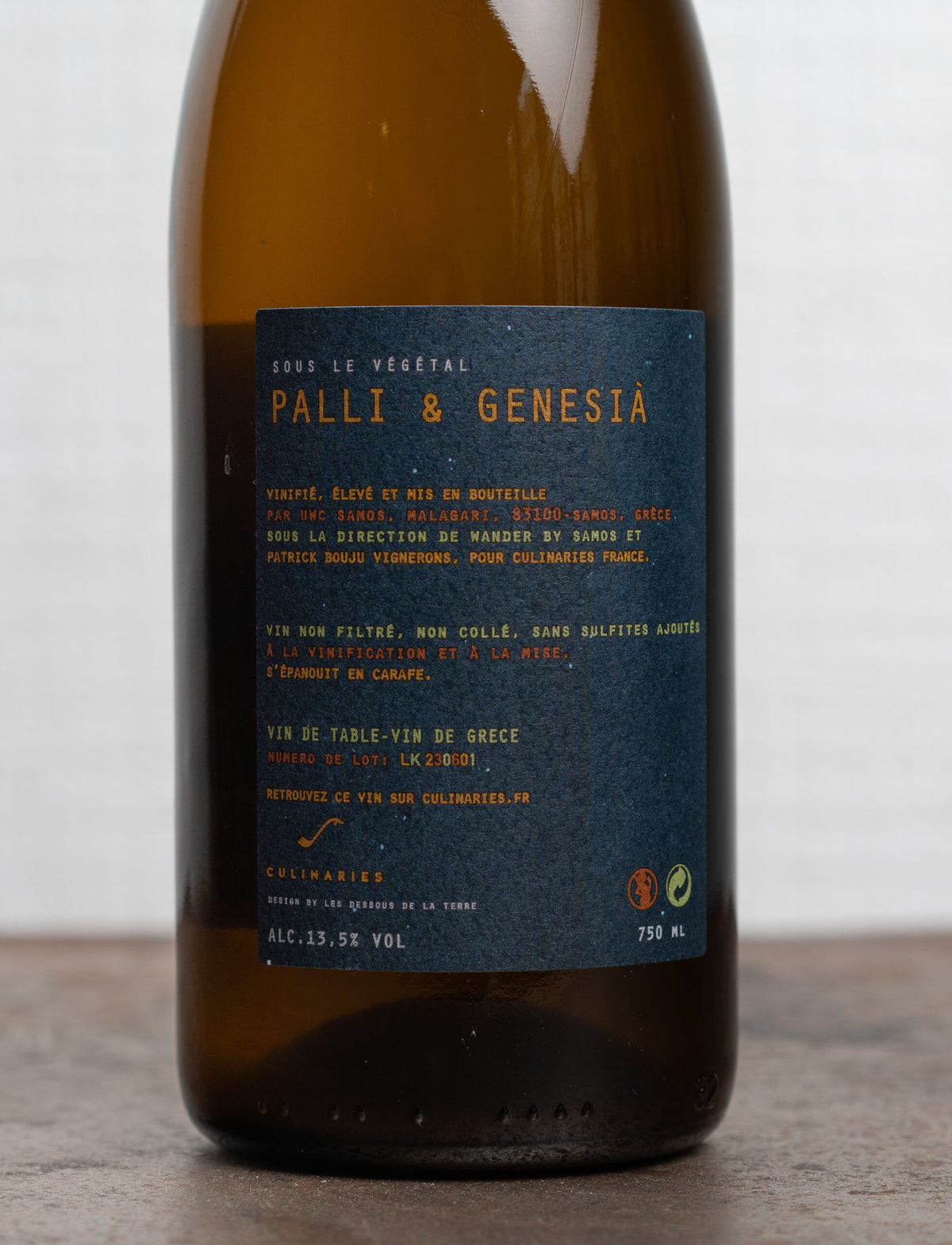 Prix unitaire / parVin Blanc sec bio et nature du terroir de Samos (mer Égée, Grèce) réalisé par Patrick Bouju pour Sous le Végétal, à base de muscat à petits grains. Frais et minéral, sans intrants ni sulfites ajoutés. Exclusivité Culinaries.