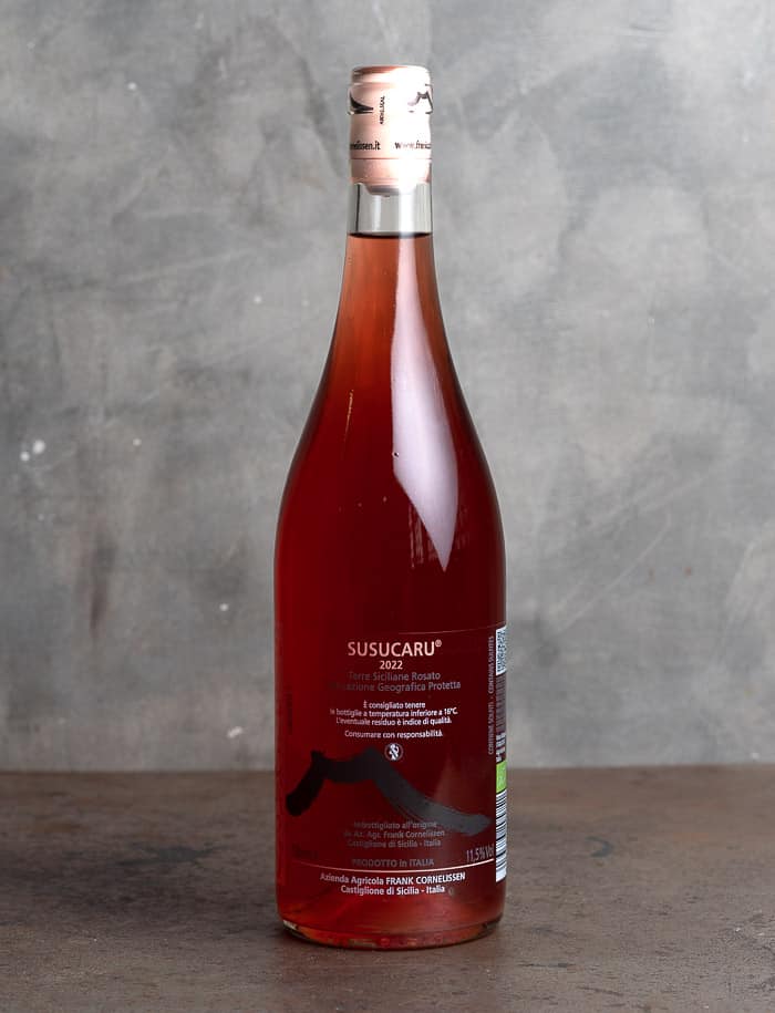 L’assemblage de Susucaru Rosato est un hymne à la Sicile et à l’Etna : 25 % insolia, 25 % malvasia, 25 % nerello mascalese, 25 % moscadella, et toutes les vignes croissent directement sur les pentes de l’Etna. La robe est rose intense, le nez charrie agrumes et fleurs blanches, et la bouche : fruitée, dense, fraîche, gourmande, avec cette fine amertume, cette morsure mélancolique qui est la signature de ce vin. Beaucoup d’aficionados piaffent d’impatience à chaque millésime de cette cuvée emblématique du maître de l’Etna, et certains n’imagineraient pas leur apéro sans elle. Susucaru rosato fait le bonheur des amateurs de rosé comme des moins fans, des initiés au vin naturel comme des débutants. D’ailleurs peut-on parler vraiment de rosé ? Techniquement oui, gustativement et chromatiquement cette petite merveille tient à la fois du rosé et du rouge de soif. Une cuvée fidèle à elle-même. « Notre rosé, explique Frank Cornelissen, est produit avec la même philosophie et les mêmes techniques de vinification que tous nos autres vins : macération pelliculaire pour la texture et l’identité territoriale, fermentation malolactique entièrement terminée pour la densité, la fluidité et la stabilité. Ce n’est pas seulement un vin d’été rafraîchissant ; c’est aussi un « rosé » qui peut également être considéré comme un rouge léger, comme un vin « jurassien », qui se marie bien avec une grande variété de plats. »