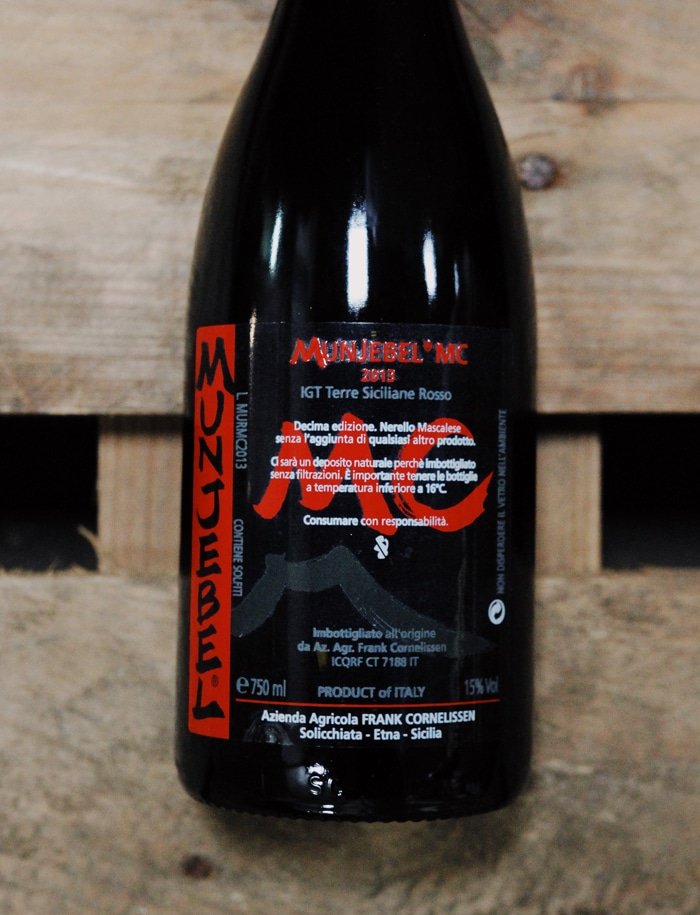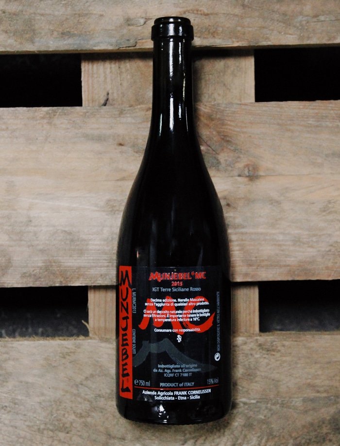 Munjebel MC, vin rouge de Sicile biologique (Eurofeuille), biodynamique et nature, est réalisé par Frank Cornelissen. Il est classé DOP (AOP) Etna Rosso/IGP Terre Siciliane Nerello Mascalese. Il provient de la contrada Monte Colla, une parcelle en terrasses très escarpée, magnifiquement exposée au soleil et au vent, juste en face du mont Etna. Les vignes de nerello mascalese, plantées en 1946, croissent sur un sol argilo-sableux.