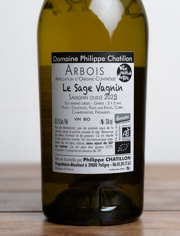 Le Sage Vagnin 2023 est une cuvée précieuse, confidentielle et empreinte de sagesse. Seulement 800 bouteilles produites chaque année, toutes issues d’un petit clos planté de vignes de Savagnin âgées de 65 ans, enracinées profondément dans les marnes grises jurassiennes. Cette rareté est le fruit du travail précis et inspiré de Philippe Chatillon, vigneron sensible au vivant, dont le domaine est certifié en agriculture biologique, et situé dans le berceau du cépage, à Arbois.