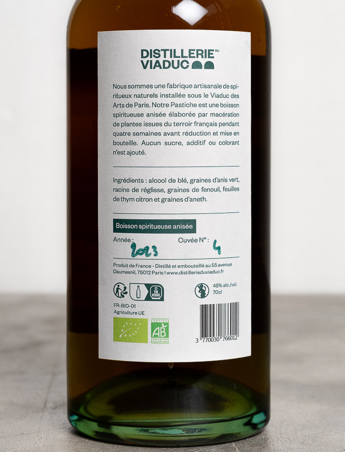 Pastiche est tout sauf une imitation. Avec cette création, la Distillerie du Viaduc affirme une vision artisanale et végétale du pastis, loin des versions industrielles saturées en sucre et arômes. Ce spiritueux anisé biologique est conçu dans un esprit de pureté, en macérant lentement des plantes entières dans de l’alcool neutre, selon un processus doux et maîtrisé qui révèle la complexité naturelle des botaniques.