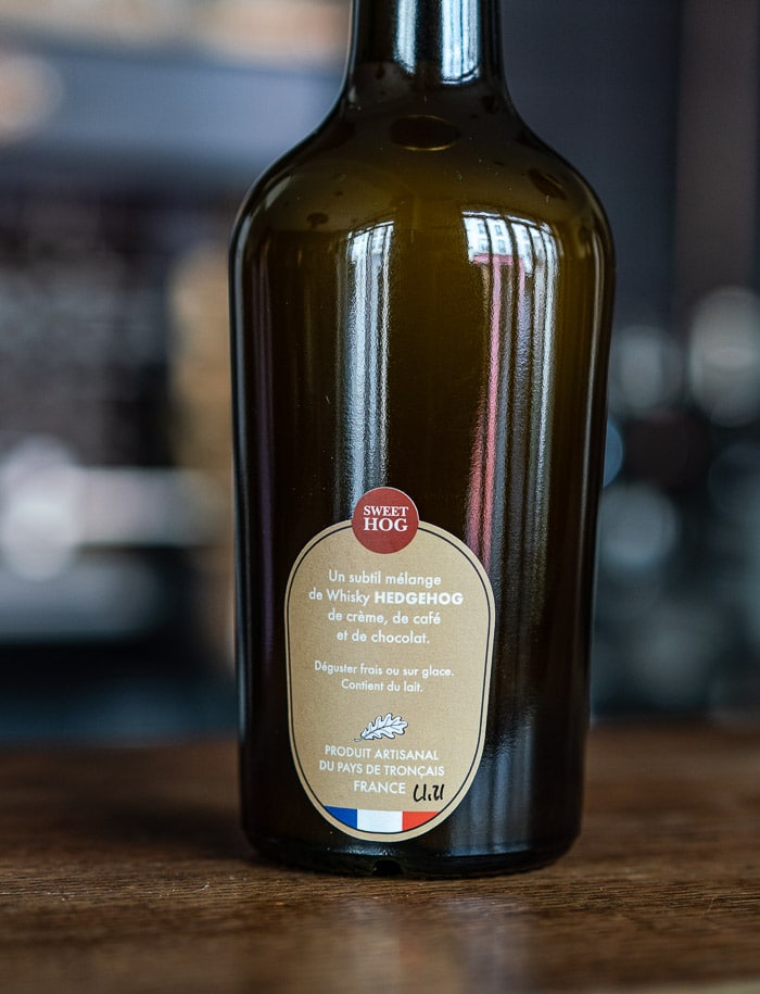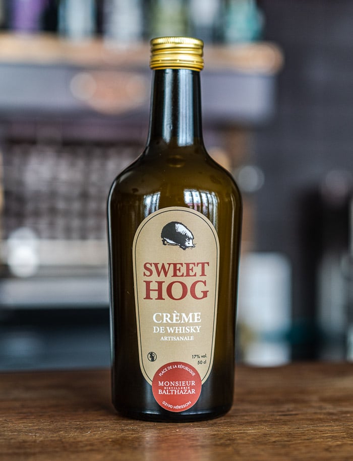 Nous l’avons cherchée longtemps, nous l’avons enfin trouvée, et nous sommes vraiment contents. Il s’agissait de mettre la main sur une crème de whisky qui tienne la route et qui soit à la hauteur de notre exigence en matière de goût et de respect du terroir. Nous ne voulions pas d’une version trop douce, trop sucrée — nous voulions du crémeux, de la saveur et de la distinction. Cette crème de whisky-là coche toutes les bonnes cases : fabrication artisanale, caractère, goût, élégance, gourmandise, originalité. Il fallait se tourner vers l’Auvergne, la forte personnalité de son terroir et la proximité de la forêt de Tronçais, dont les chênes servent depuis des siècles à fabriquer les plus beaux mâts de navire et les plus belles barriques d’affinage pour vins et alcools. Sweet Hog Doux hérisson », la distillerie se trouvant à Hérisson, dans l’Allier) est fabriquée à partir du whisky Hedgehog de la maison, de crème, de café et de chocolat. Elle est délicieuse, nous avons envie de dire ravissante (avec modération). L’équilibre de goût est une merveille : point trop sucrée, très parfumée, une petite goutte onctueuse et réconfortante à boire seule, bien fraîche, à utiliser en mixologie (vos White Russian et autres Alexandra vont en frémir de bonheur, voyez nos recettes) ou sur des desserts.