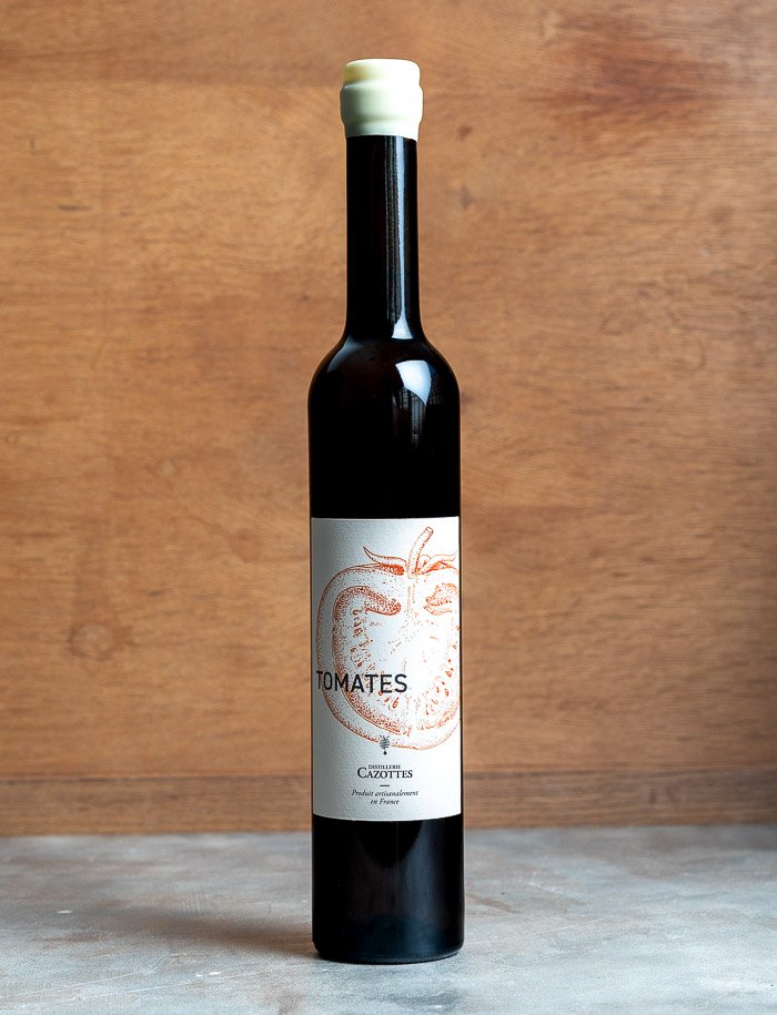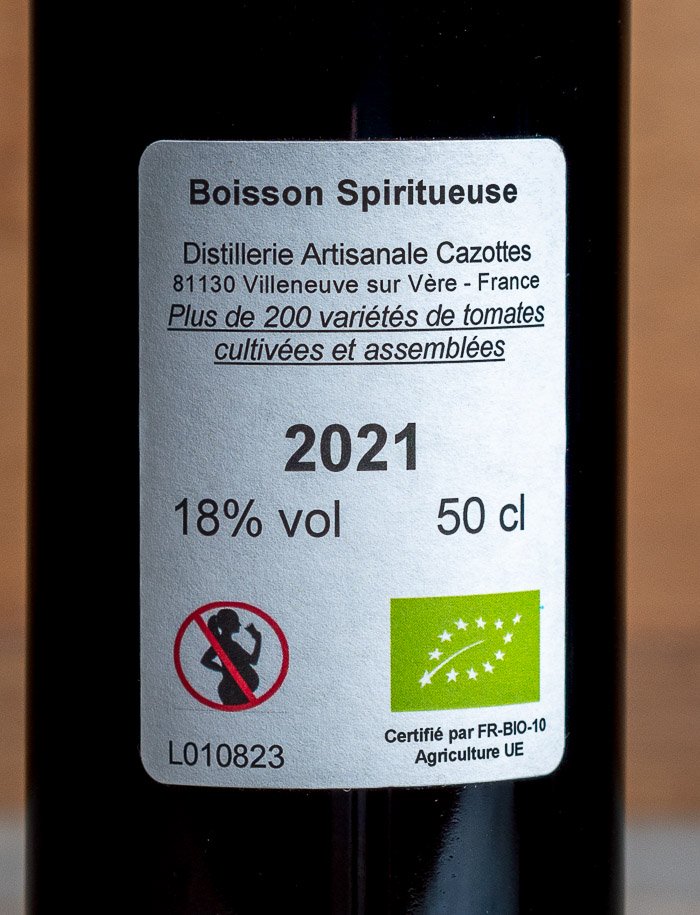 Liqueur de tomates biologique et naturelle de la Distillerie Cazottes, entièrement élaborée par Laurent Cazottes dans le Tarn (Rouergue, Sud-Ouest) à partir des tomates et de l’eau-de-vie de sa propriété.