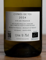 Cyprès de Toi 2024, un chardonnay du sud tout en fraîcheur signé Fond Cyprès. Bio, fruité, citronné et floral, élevé en cuve inox. Une cuvée vive et limpide, parfaite pour les apéritifs, les crustacés ou les volailles légères.
