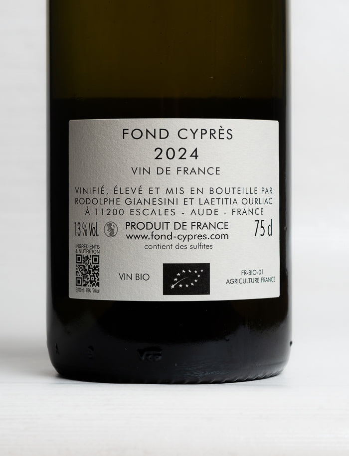 Le Blanc des Garennes 2024 est un blanc nature élégant et solaire, signé Fond Cyprès. Assemblage de Grenache blanc, Roussanne et Viognier, élevé en barriques. Une cuvée fraîche et florale, parfaite pour la cuisine méditerranéenne.