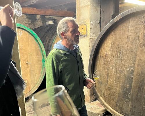 « La macération, en Alsace, c’est une tradition ! affirme Jean-Marc Dreyer, ajoutant que le pressurage direct dans cette région est une invention moderne, liée à l’apparition de l’électricité. Autrefois, on travaillait à la main et on laissait macérer les raisins avant d’envoyer les marcs au pressoir. » La macération en grappes entières est la signature de Jean-Marc Dreyer et représente 85 % de la production du domaine, le reste consistant en blancs de pressurage direct, souvent élevés en oxydation ménagée. Jean-Marc succède à plusieurs générations de sa famille au domaine Dreyer & Fils, créé en 1830 entre Obernai et Molsheim. Dès sa reprise du domaine, il opte immédiatement pour la biodynamie, mais il hésite quelque temps entre plusieurs méthodes : au début, ses vins sont plus boisés, élevés en barriques neuves avec bâtonnage. Ensuite, période sucrée : tous ses vins contiennent du sucre résiduel. En 2008, il essaie de vinifier sans aucun soufre et trouve sa direction : l’hiver suivant, au retour du pèlerinage de Compostelle, il jure de ne plus jamais ajouter de soufre dans aucun vin. Cette décision prise, il affirme son style autour de la macération pelliculaire, assez poussée, ciselée, toujours surprenante sur les cépages alsaciens, dont elle fait ressortir la structure sans sacrifier la délicatesse. Jean-Marc travaille en cuvées monocépage ou d’assemblage et réalise également des rouges de pinot noir d’une profondeur surprenante.