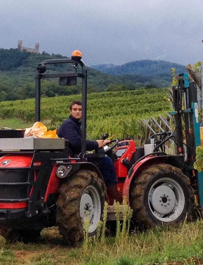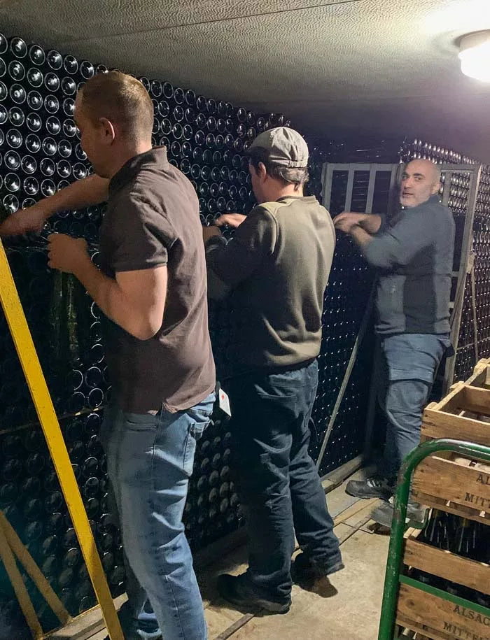 Appartenant à une famille établie depuis 1601 dans le village viticole alsacien de Mittelbergheim, le domaine Armand Gilg porte le nom de son fondateur, qui orienta résolument l’activité familiale vers la viticulture en 1937. Depuis, les Gilg restent aux commandes, ont agrandi le vignoble d’un hectare initial à vingt-neuf hectares, acheté des caves pluricentenaires pour les bouteilles et les foudres, et construit des bâtiments pour le pressurage et d’autres activités de vinification. Le domaine, classé en HVE (Haute Valeur Environnementale) pendant plusieurs années, a acquis en 2021 la certification d’agriculture biologique. Ses parcelles, disséminées autour du village, se regroupent en une centaine d’ensembles, dont cinq hectares sur le fameux Grand Cru de Zotzenberg, un des lieux-dits les plus réputés d’Alsace, et un hectare uniquement planté de riesling sur le Grand Cru Moenchberg. La production embrasse tous les sept cépages traditionnels alsaciens (pinot noir, sylvaner, auxerrois, riesling, muscat, pinot gris et gewurztraminer), incluant aussi le chardonnay pour les crémants et le klevener de Heiligenstein (savagnin rose). Si toutes les cuvées du domaine Gilg sont en bio, deux cuvées nature sont réalisées, l’une à base de pinot noir, l’autre à base de sylvaner, au sein de la série Les Spontanés dédiée aux vins sans intrants.