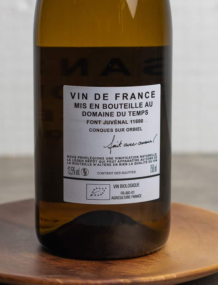 Le domaine du Temps est situé dans le Cabardès, un petit pays du Languedoc qui fut autrefois une subdivision du Pays cathare. Partant du versant sud de la Montagne Noire à la ville de Carcassonne, il est limité à l’ouest par le Lauragais et à l’est par le Minervois. Vallonné, sauvage, riche en flore méditerranéenne, c’est un écosystème préservé, d’autant plus que le domaine du Temps, au lieu-dit Font Juvénal, est un lieu magique : autour d’un ancien prieuré du XVIIIe siècle, soixante hectares de forêts et de garrigues protègent treize hectares de vignobles sur sols argilo-calcaires pierreux. L’équilibre entre sécheresse et fraîcheur est une aubaine pour la viticulture, avec une palette de cépages étendue. En plus des cépages languedociens (syrah, grenache, roussanne, viognier, muscat) croissent cabernet sauvignon, cabernet franc, merlot, sémillon et chenin. Le domaine est labellisé Ecocert depuis 1998, entièrement mené en biodynamie, et consacré au vin nature depuis 2015. Le travail de la vigne et du chai est méthodique, rigoureux et attentif : seul le meilleur du raisin est conservé, ce qui donne de petits rendements, et l’éraflage est décidé en fonction de la maturité de la grappe. Les rouges sont vinifiés en macération carbonique de cépages individuels, l’assemblage étant réalisé avant l’élevage d’un an. Les blancs sont lentement et doucement pressés afin de n’extraire que le meilleur du raisin. Ces précautions donnent des vins suaves et maîtrisés, d’une grande droiture, avec des tannins très souples. Ils sont frais, gourmands et expressifs.