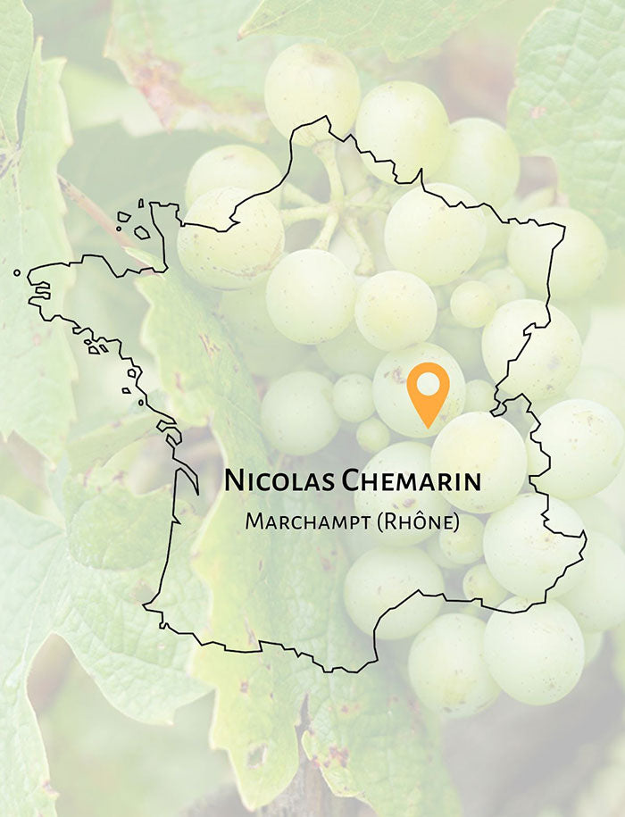Nicolas Chemarin, surnommé « P’tit Grobis » en sa qualité d’habitant de Marchampt (Beaujolais), est la quatrième génération de vigneron sur son domaine viticole familial en appellation Beaujolais-Villages, sur une terre tout en cailloux où il cisèle des vins surprenants de profondeur et de sincérité. C’est en 2005 qu’il reprend deux hectares de vignes de son père et en 2006 qu’il signe ses premières cuvées. En 2008, il acquiert d’autres vignes et décide de se consacrer uniquement à son domaine dont le terroir, très escarpé, consiste en sols rocailleux et pauvres sur une roche granitique grise. Les vignes reposent sur le substrat rocheux à travers un sol très mince, et leurs racines plongent profondément dans la roche. Selon la configuration du sol, les vignes sont taillées en gobelet ou relevées sur échalas. Leur âge moyen est de quatre-vingts ans. L’encépagement, gamay et chardonnay, est classiquement beaujolais. Nicolas exploite aussi deux autres terroirs sur l’appellation Régnié : Les Bullats, aux sols sableux légers et filtrants, et La Haute Ronze, très proche de Morgon, dont les sols, plus profonds et argileux, donnent des vins charpentés. Les crus subissent de longues macérations (de 18 à 30 jours) avec pigeage et contrôle des températures (Nicolas travaille à froid, autour de 20 °C). L’élevage se fait partiellement en cuves de béton thermorégulées pour un tiers, les deux tiers restants passant en fûts de quatre à dix vins afin d’apporter une oxygénation mais peu ou pas de sensation boisée. Nicolas Chemarin est déjà très connu dans le milieu du nature pour ses cuvées friandes et fruitées, des vins de plaisir, et pour des crus issus de terroirs ardus et magnifiques, pourvus d’admirables et complexes notes minérales, aromatiques et épicées