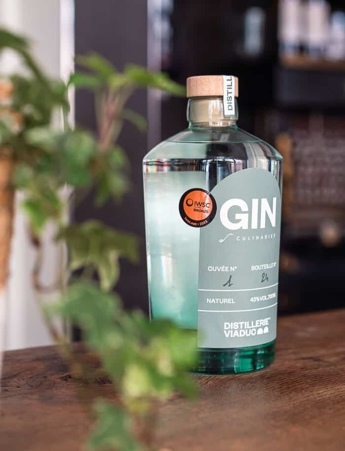 Nous sommes très fiers de pouvoir vous proposer le gin Culinaries, notre premier spiritueux maison, résultat de notre collaboration avec la Distillerie du Viaduc, située à Paris, dans le XIIe arrondissement. L’équipe de la distillerie — en la personne de ses deux fondateurs, Théo et Quentin — a travaillé pour déterminer le profil de ce breuvage, s'accorder sur la recette et ses dominantes aromatiques. Nous voulions un gin très frais, à la palette aromatique nette et droite. Une fois la composition du macérat fixée après plusieurs tâtonnements, le bouquet de plantes, 100 % bio et françaises, et d’épices a été réuni par les deux distillateurs : toujours des plantes séchées, pour la conservation et la concentration des arômes. La macération de plantes sèches donne en effet un gin plus goûteux. Les ingrédients sont d’abord macérés dans de l’alcool neutre à base de blé titrant 96 %, et le tout est ensuite distillé. La double distillation ayant déjà été effectuée pour obtenir l’alcool, c’est une triple distillation qui est effectuée avec les plantes, qu’on laisse dans le macérat pour mieux extraire les huiles essentielles. Le gin est distillé dans un des deux alambics de la maison. Une fois le gin distillé, il est mis en bouteilles à la distillerie même, dans de jolies bouteilles en verre transparent d’un bleu aquatique rafraîchissant.