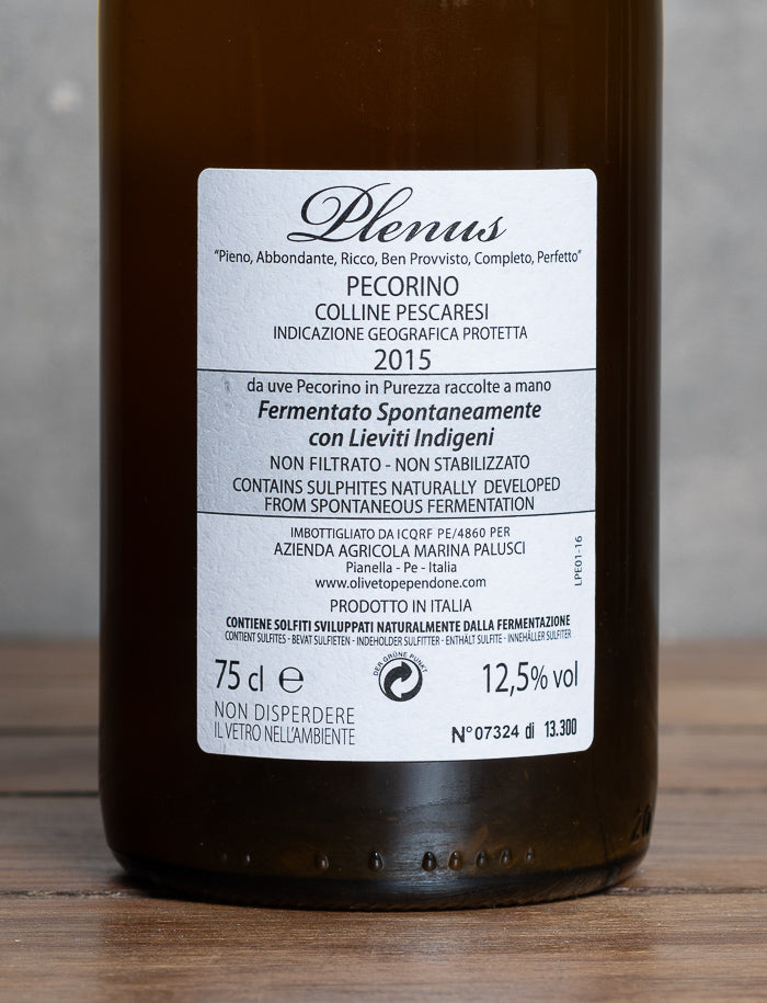 Le Plenus 2015 est né sur les terres vivantes des Abruzzes, à Montepulciano d’Abruzzo, où le cépage Pecorino trouve une expression singulière. Sur des sols argilo-calcaires, cette variété autochtone déploie une matière généreuse, portée par l’énergie minérale du terroir. C’est un vin de lieu, façonné par les courbes des collines italiennes et la main discrète des équipes de l’Azienda Marina Palusci.