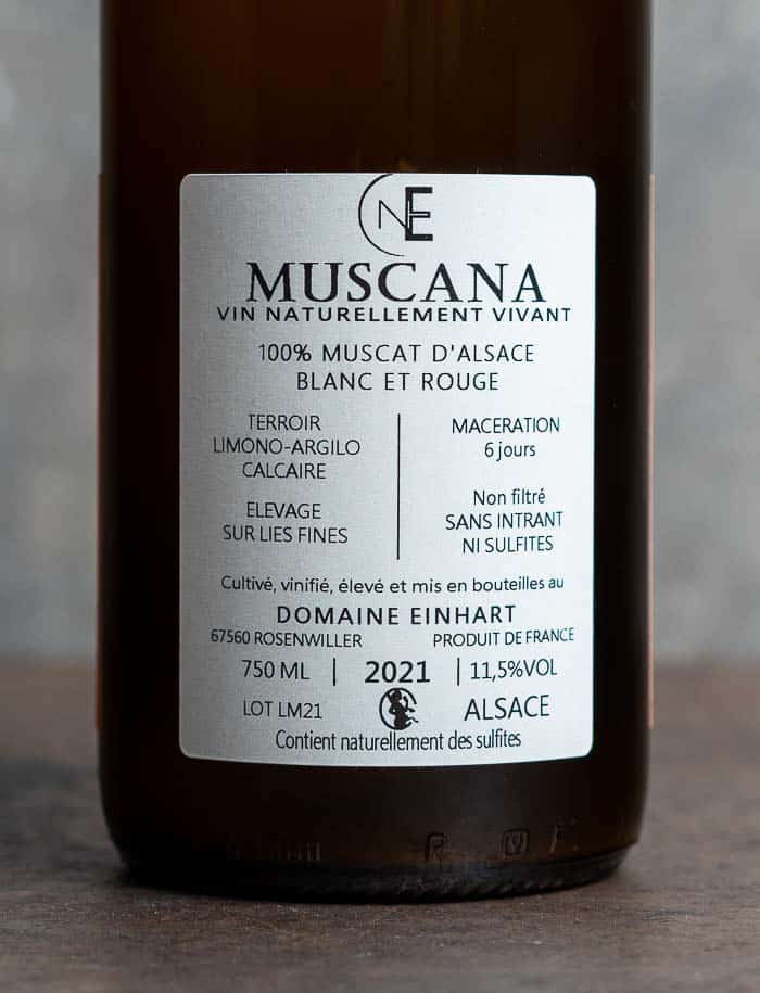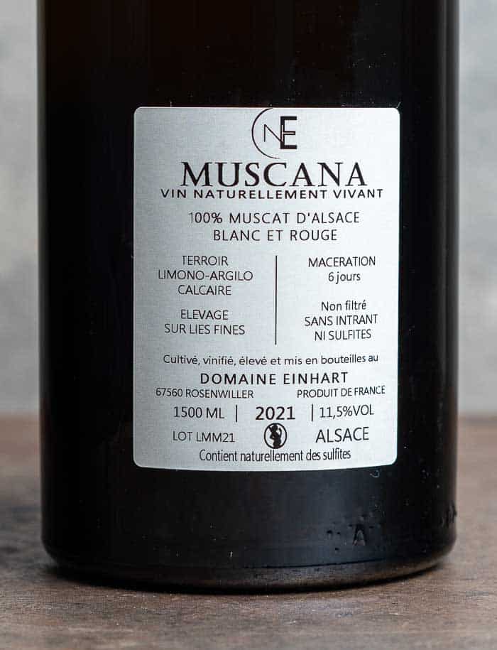 Vin blanc sec de macération bio et naturel d’Alsace à base de muscat, complexe et aromatique.