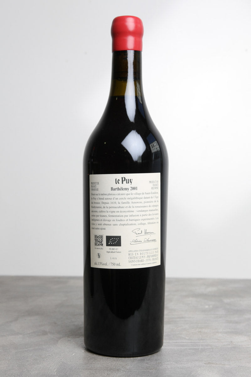Barthélemy 2001 du Château Le Puy, élaboré par Jean-Pierre Amoreau, est une cuvée parcellaire d’exception issue des plus vieilles vignes du domaine. Conduit en biodynamie, sans aucun produit de synthèse, ce vin incarne l’essence même du terroir dans une expression pure et sans artifice.