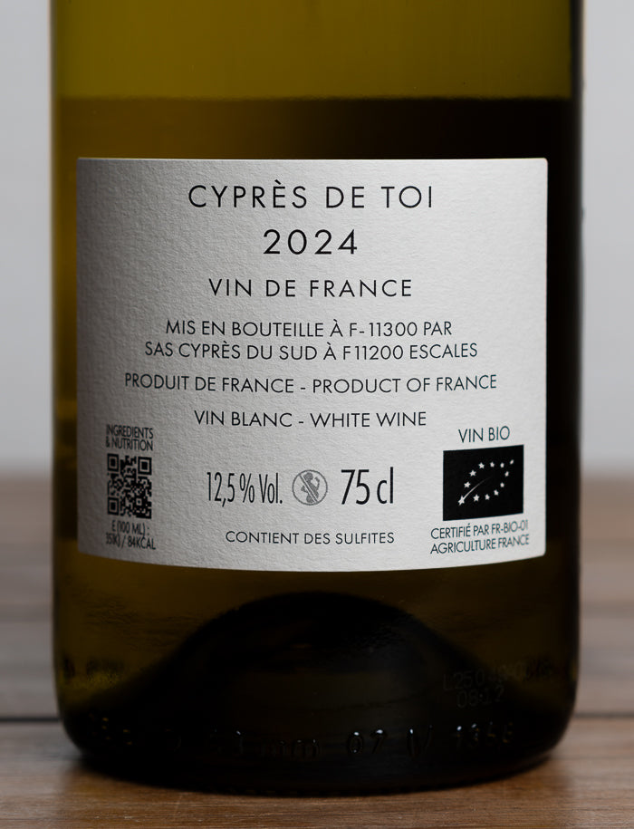 Cyprès de Toi 2024, un chardonnay du sud tout en fraîcheur signé Fond Cyprès. Bio, fruité, citronné et floral, élevé en cuve inox. Une cuvée vive et limpide, parfaite pour les apéritifs, les crustacés ou les volailles légères.