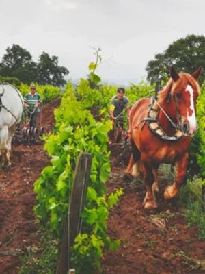 À la vigne, le travail du sol se fait en douceur, souvent avec de l’aide animale pour éviter la compaction. Les vendanges se font à la main, avec une sélection minutieuse pour protéger chaque grappe.