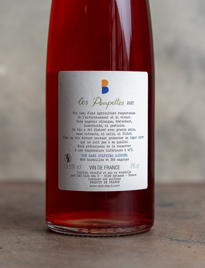 Vino rosso biologico e naturale proveniente dai terroir del Golfo di Saint-Tropez, prodotto al 100% da uve Grenache. Fresco e leggero, un delizioso gorgoglio del sud, prodotto da Gwendolyn Berger e Jean-Jacques Branger di Clos des B. Senza additivi né solfiti.