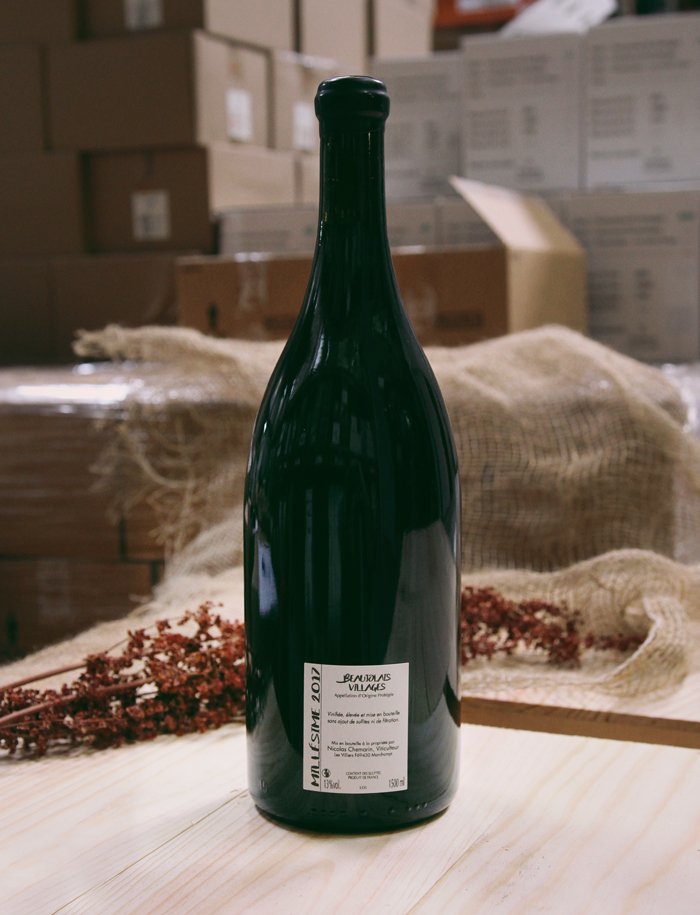 Vino rosso della denominazione Beaujolais-Villages, 100% Gamay, biologico e naturale, fresco e fruttato.