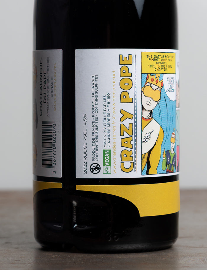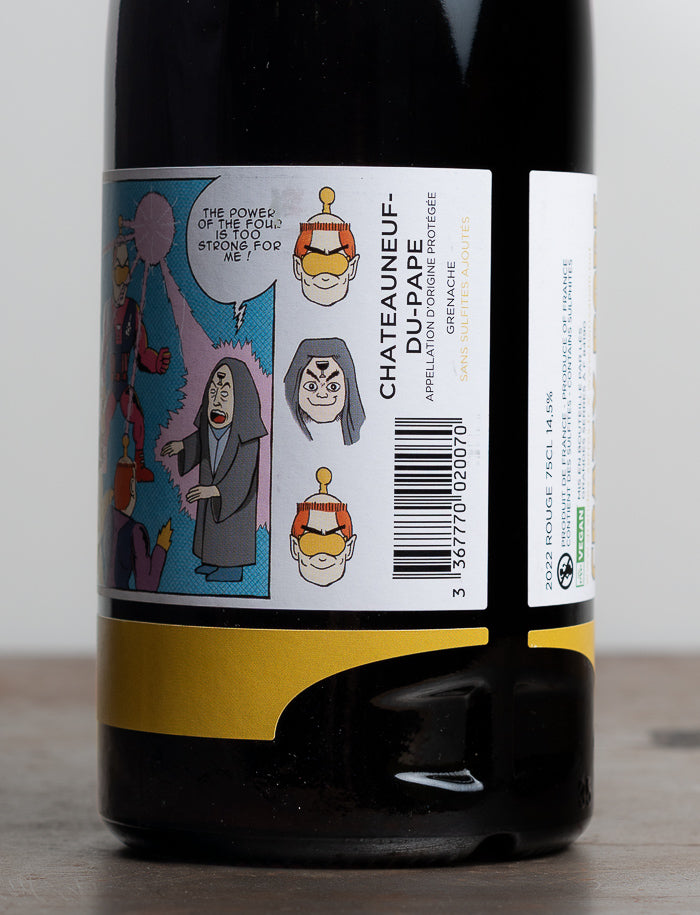 Une interprétation naturelle et puissante de Châteauneuf-du-Pape, sans sulfites ajoutés. Grenache mûr, élevage en barriques, profondeur et intensité du terroir.
