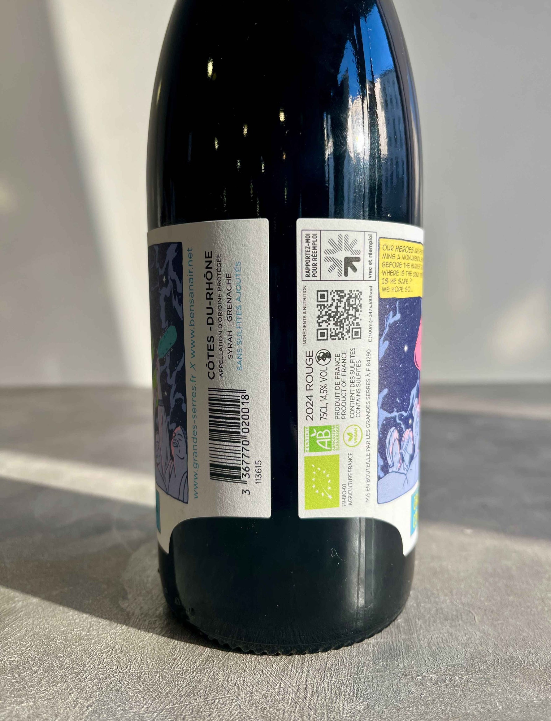 Questo Côtes-du-Rhône del Domaine des Grandes Serres è ciò che suggerisce il nome: un vino rosso biologico e naturale della bassa valle del Rodano, nella AOC-AOP Côtes-du-Rhône-Villaggi. Fa parte della serie naturale "Comics" della tenuta (vedi etichetta).