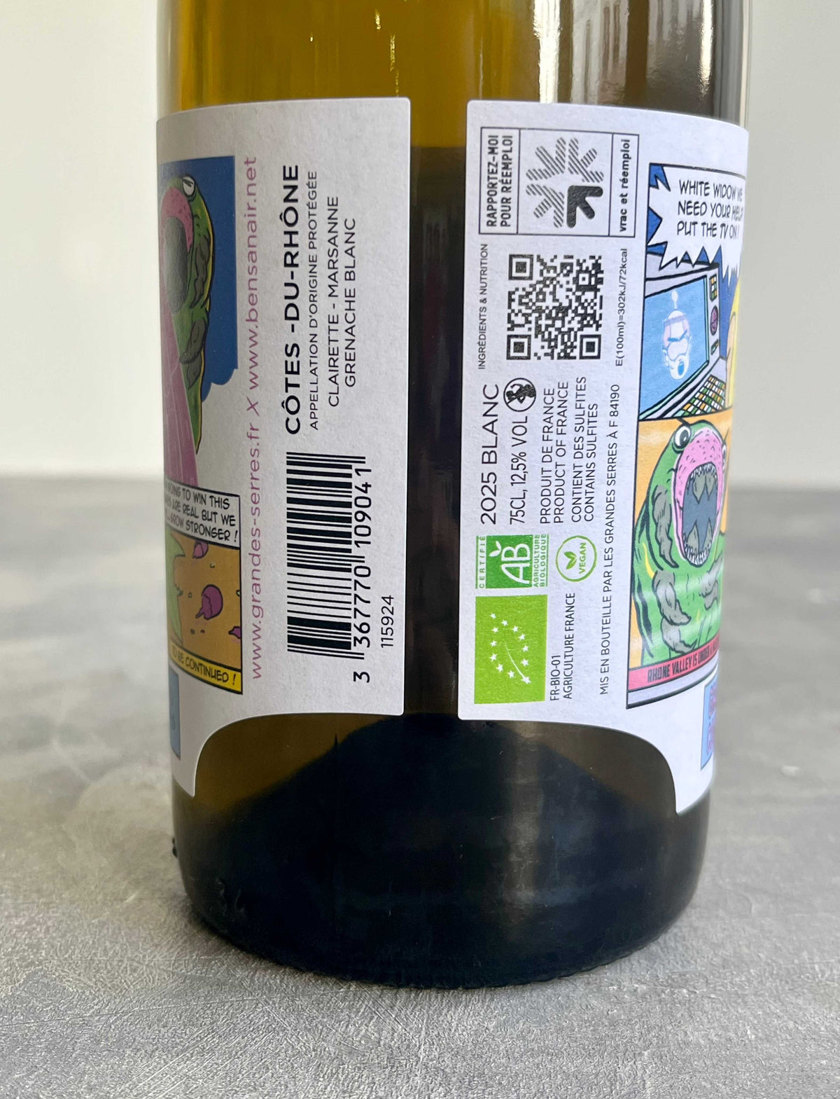 Situato tra Vaison-la-Romaine e Séguret, il vigneto Grandes Serres, certificato biologico, promuove un approccio agroforestale innovativo, che include la piantumazione di pistacchi lungo i bordi degli appezzamenti. Questa cuvée, The White Widow 2024, ottenuta da un assemblaggio di Clairette, Grenache Blanc e Marsanne, esprime con eleganza la ricchezza dei terreni sabbiosi del Rodano.