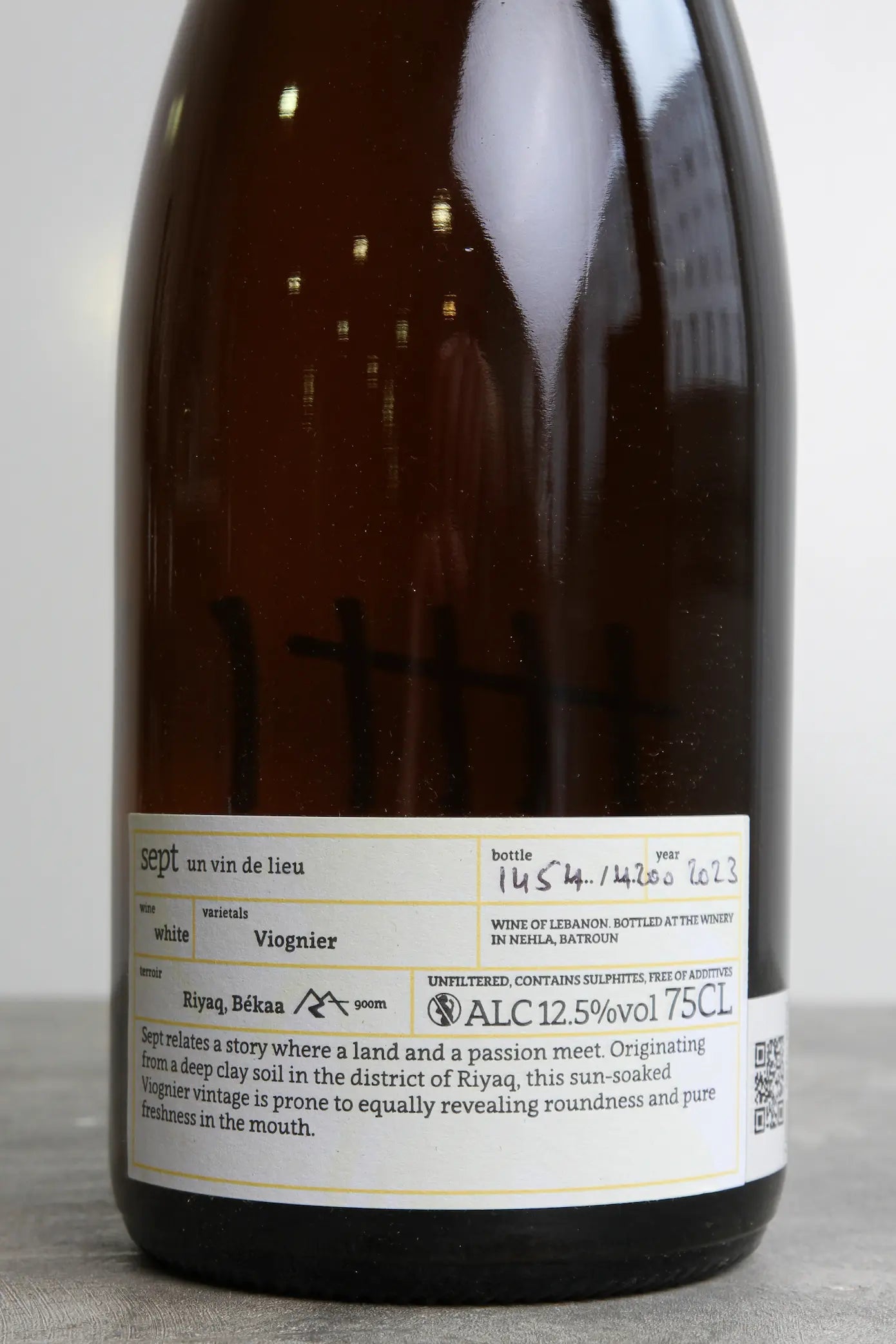 Issu de Viognier (100 %), ce vin provient de vignes de plus de 25 ans situées à Riyaq, à 900 mètres d’altitude, sur des sols profonds d’argiles rouges et une exposition est.