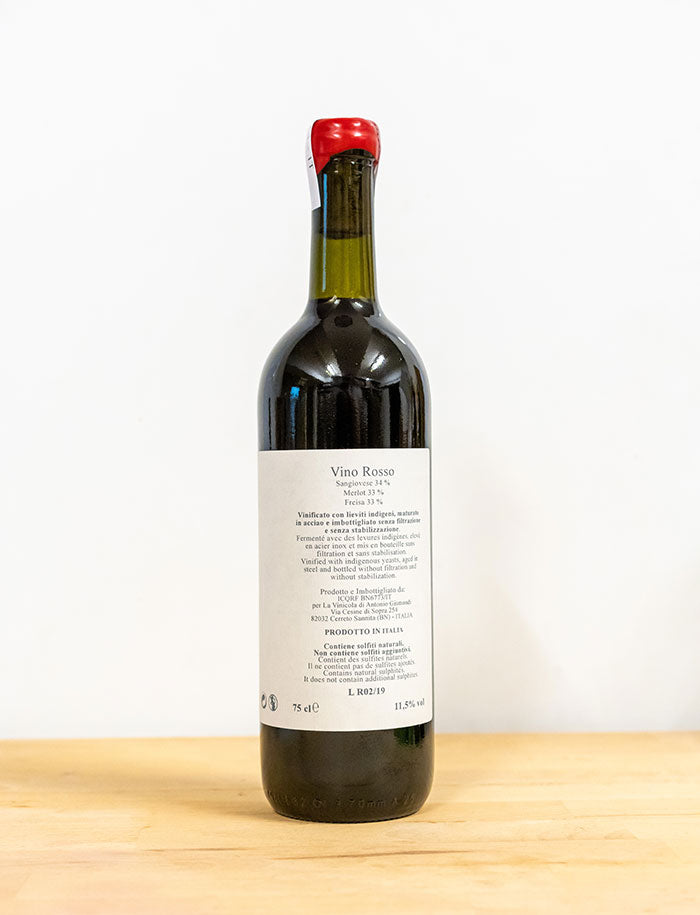 Un raffinato blend di Merlot, Sangiovese e Freisa. Un profumo di sottobosco, frutti rossi e una piacevole acidità al palato. Un vino da invecchiamento. Un vino naturale senza solfiti aggiunti.