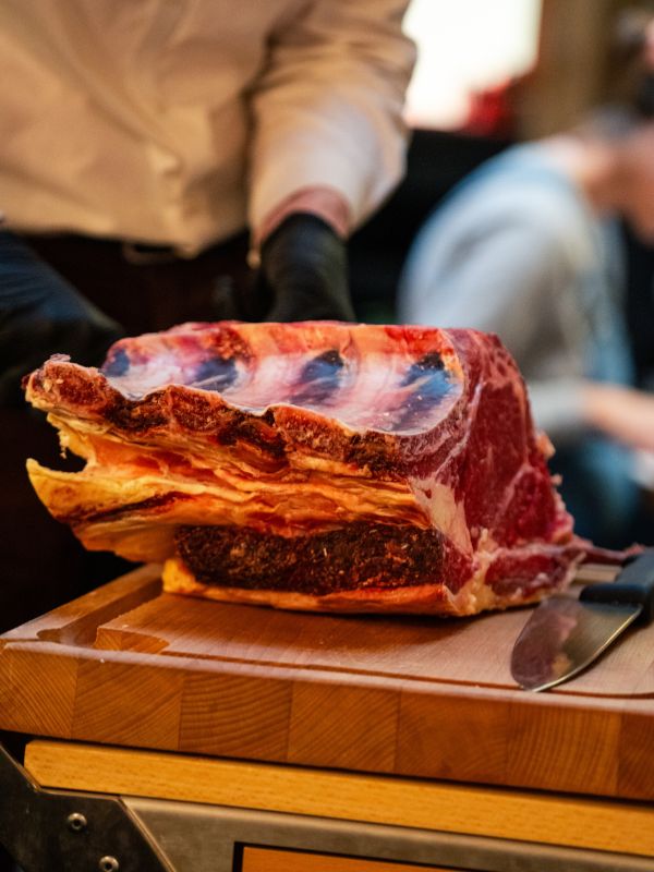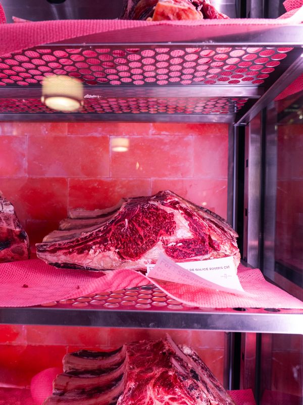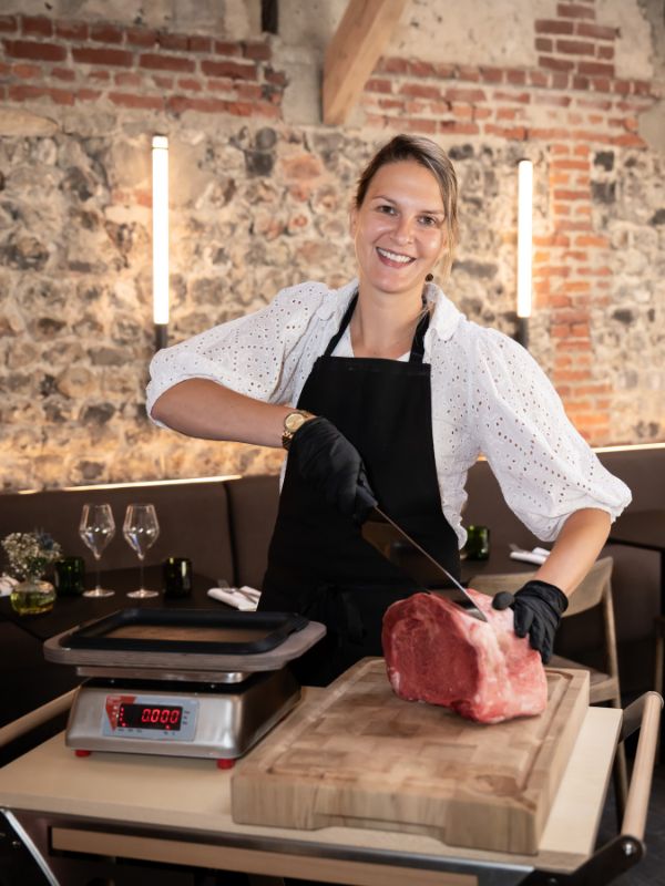 En salle, les équipes assurent une démonstration unique avec la présentation et la découpe des viandes sur chariot, ainsi que la pesée à la balance devant les clients.