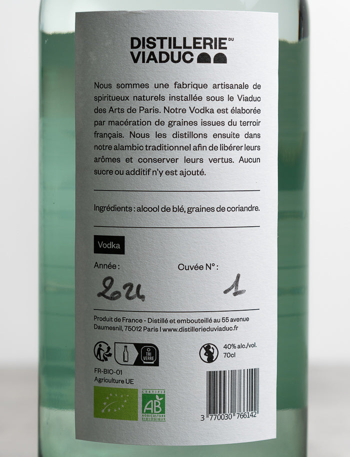 Avec cette Vodka artisanale, la Distillerie du Viaduc nous propose une relecture audacieuse et végétale du spiritueux le plus neutre en apparence. Élaborée à partir d’un alcool de blé soigneusement sélectionné, cette vodka biologique tire toute sa singularité d’une macération de graines de coriandre, dont une partie est torréfiée maison pour révéler une complexité aromatique rare.
