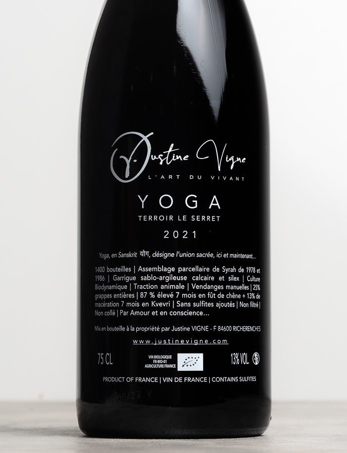 C'est au cœur de la Vallée du Rhône, sur un terroir librement interprété sous l'étiquette "Vin de France", que Justine Vigne signe Yoga 2021. Une cuvée 100 % Syrah, cultivée avec passion sur des sols baignés de soleil, où les vignes puisent leur force dans la roche et le temps. Ce choix d'appellation libre permet à la vigneronne d'exprimer sans contrainte toute la richesse de son raisin, fidèle à l'identité de son vignoble et à sa vision artisanale du vin.